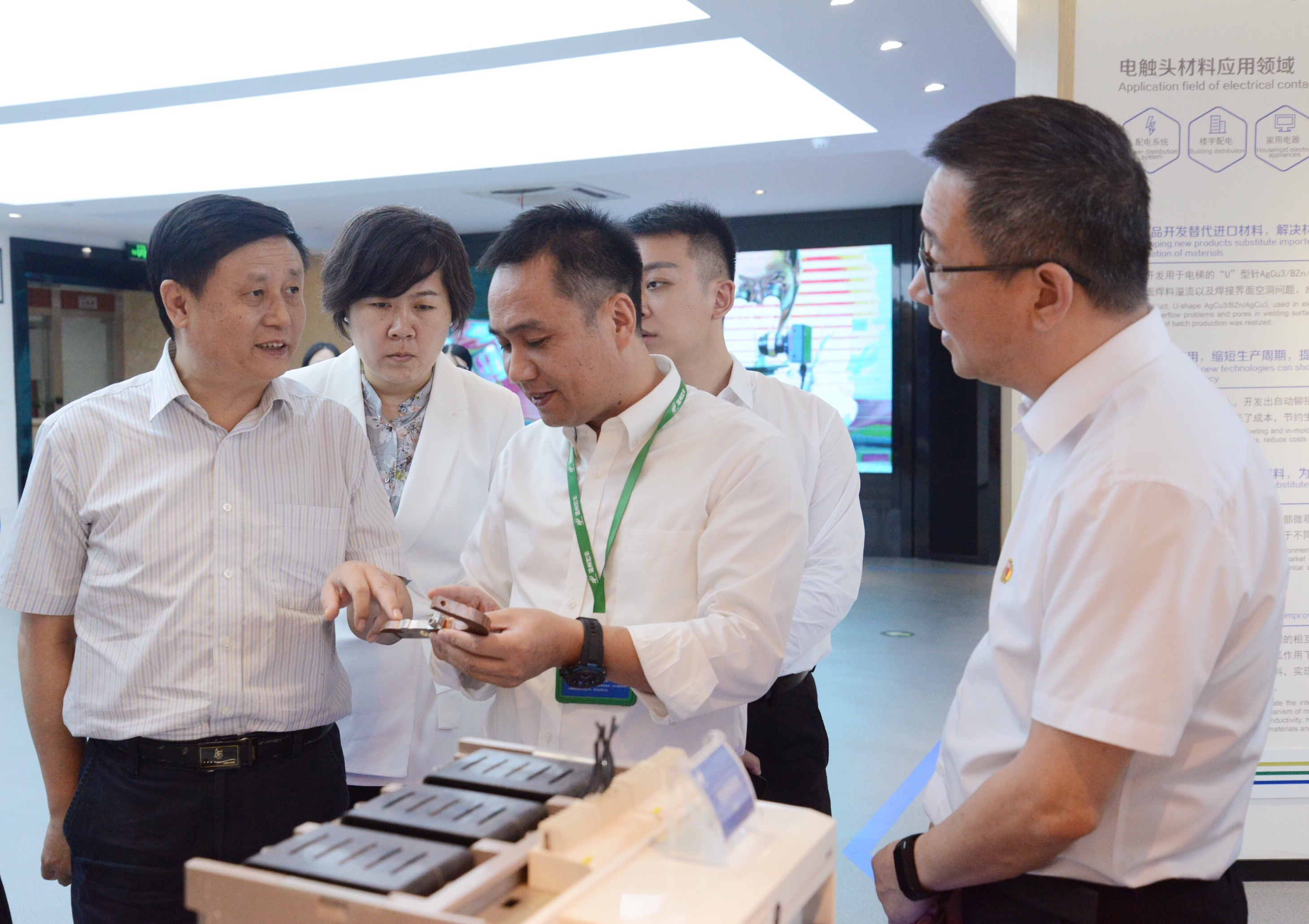 于立志巡視員一行參觀了公司展示廳、CNAS國家認可實驗室、省級重點企業(yè)研究院及博士后工作站,詳細了解了公司的生產(chǎn)經(jīng)營情況,并就電接觸材料行業(yè)的發(fā)展和前景與董事長陳曉進行了交流。